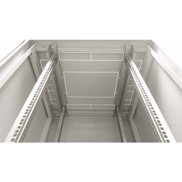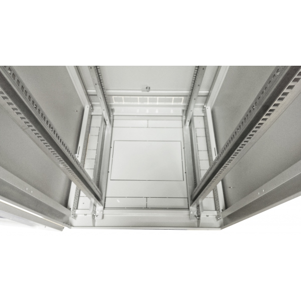 Внутри шкафа находятся усиленные стойки для удобного крепления и регулирования по глубине различного сетевого оснащения. Для удобства размещения все панели шкафа снимаются, что позволяет производить монтаж с 4-х сторон. По завершению установки оборудования, стенки шкафа возвращаются на свое место без особых усилий. Для фиксации панелей необходимо придавить ее в месте замка и повернуть ключ. Нагрузка распределяется по конструктиву шкафа. Данная модель создана таким образом, что вентиляция оборудования происходит естественным путем, через перфорированные карманы в верхней и нижней части корпуса, а также через дверь. Для размещения оборудования, которое требует дополнительное охлаждение, есть возможность прикрепить блоки вентиляторов в верхнюю и нижнюю стенку.