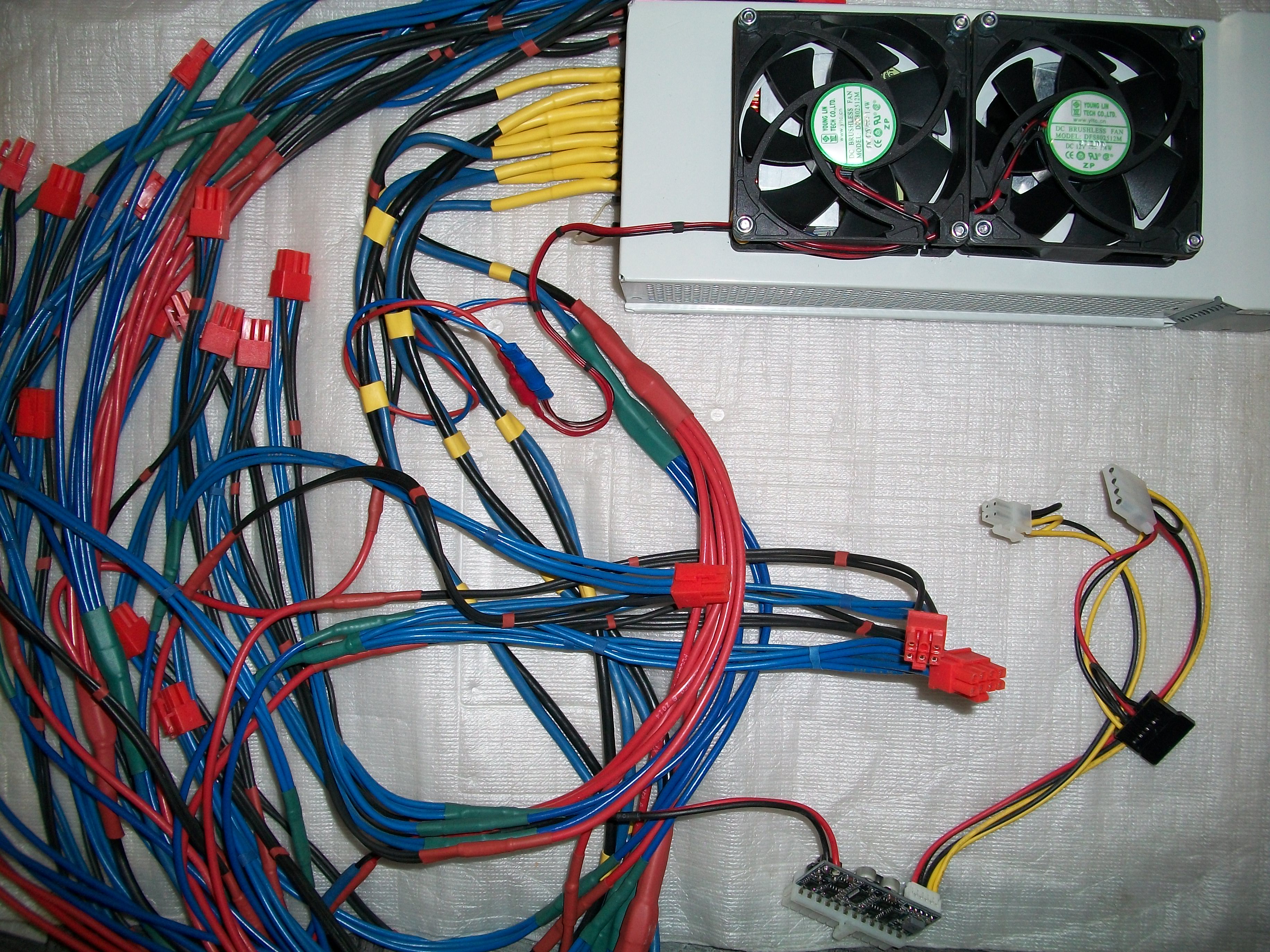 Все провода для питания райзеров и дополнительных разъемов видеокарт типа 6pin. Используются медные провода 1,5 кв.мм., которые сходятся группами в общие провода 2,5 кв.мм., которые, в свою очередь, сходятся в провода 6 кв.мм. Наименьшая длинна провода до коннектора - 75 см, наибольшая длина провода - 120 см (под риг 1*0,4*0,33 м).
