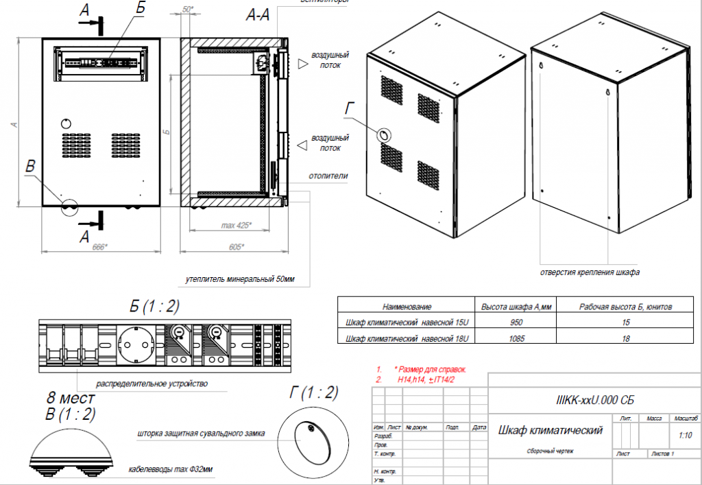 Оптимальные для работы электронных компонентов температурные условия автоматически поддерживаются посредством обдува вентилятором, нагревательного элемента и термостата. Базовая комплектация включает электрораспределительную панель с набором термостатов, общий рубильник, дополнительную розетку, датчик открытия двери, автоматы включения/выключения. В качестве утеплителя между двойными стенками шкафа используется минеральная вата. Кабеля вводятся при помощи герметичных вводов, расположенных внизу шкафа. Для защиты от краж и неконтролируемого доступа в корпус встроен сувальдный замок с трехточечным запиранием. Максимально допустимая статическая нагрузка составляет 100 кг.