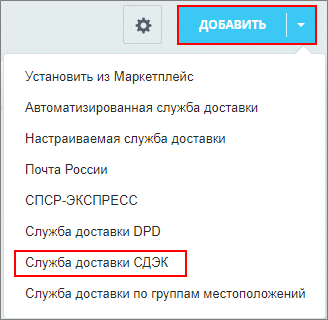 Открываем страницу списка служб доставки (Магазин > Настройки магазина > Службы доставки), нажимаем кнопку Добавить и выбираем из выпадающего списка служба доставки СДЭК .