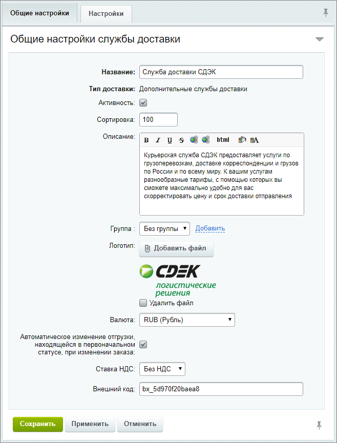 - Общие настройки - данные заполнены по умолчанию. При необходимости, укажите группу служб доставки и ставку НДС;