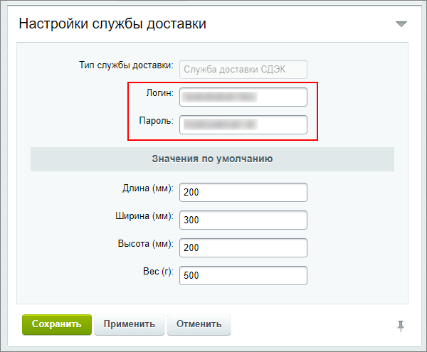 - Настройки - запросите в службе доставки СДЭК логин и пароль для запросов API калькуляции и внесите их в поля Логин и Пароль.