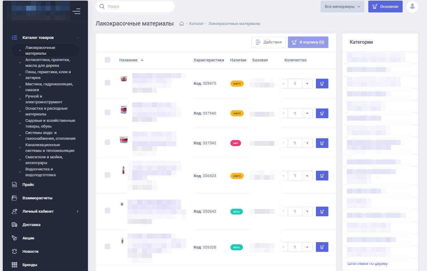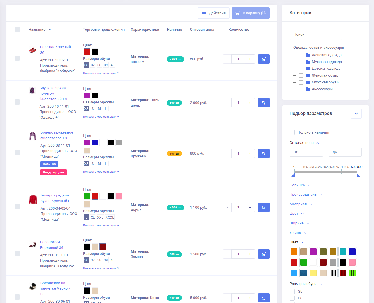 Войдя в систему клиент видит общий перечень каталогов и товаров с фильтрацией по свойствам и характеристикам (в случае использования таковых) *
